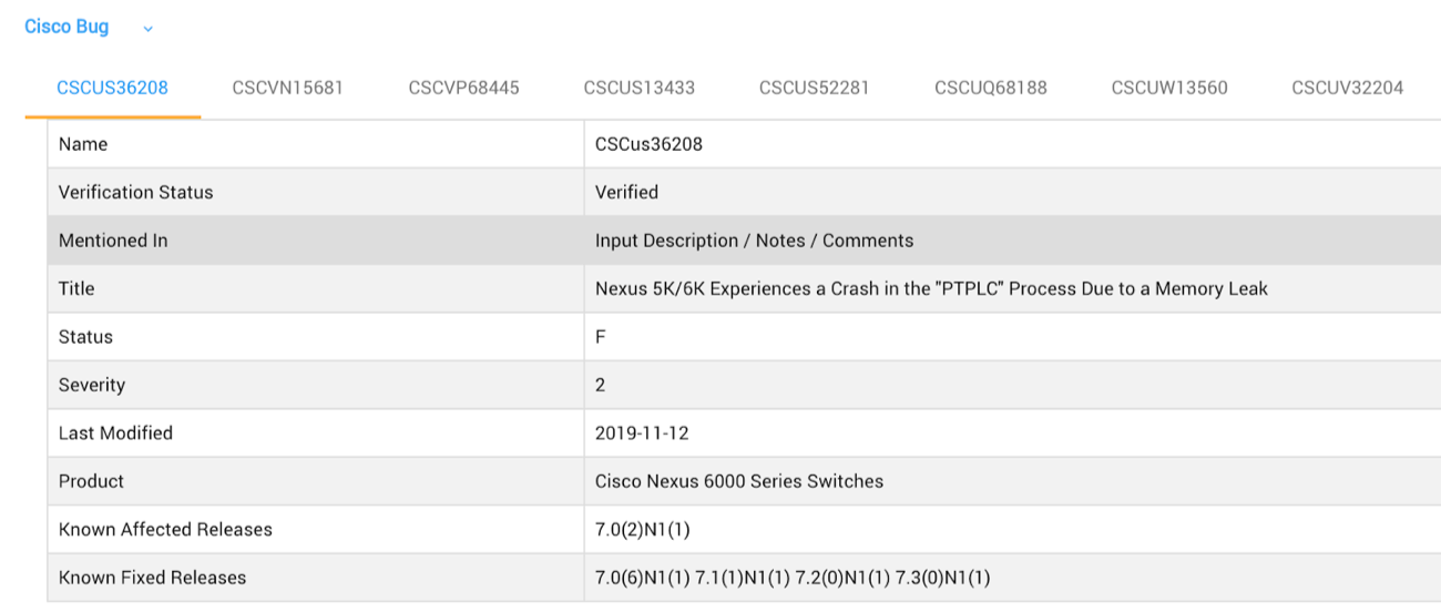 - Cisco Bugs/Defects: Retrieve key bug/defect details, including related bugs. Details include defect status, severity, product, affected versions/releases, known fixed versions/releases