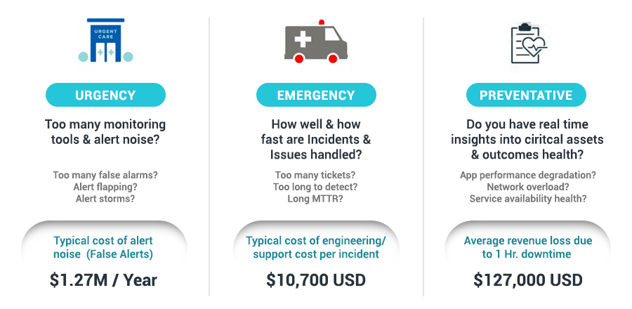 IT operations teams have been tasked to deal with exponential data growth, hybridization, a myriad of operational tools, countless metrics, ever increasing false alert volume, security threats and topping them off with budget cuts, growing customer demands, stringent SLA requirements. All this puts ITOps teams in a tough spot. However, these same paradigm shifts have also led to in drastic increase in monitored assets, numerous operational tools, and exponential growth of operational data. As a result, modern IT organizations are facing challenges in these three key areas: